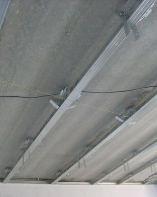 - Далее переходят к возведению каркаса из основного профиля (CD). Для этого с шагом 60см вдоль комнаты устанавливают основной несущий профиль. Края основного профиля внедряют в направляющий профиль и крепят их к нему с помощью саморезов.