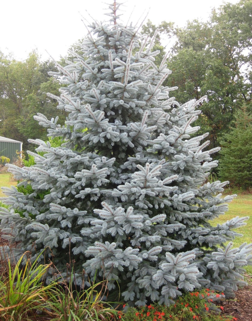Типичная голубая ель с густой кроной в виде конуса, расширяющегося к низу. Хвоя пушистая, имеет серебристо-голубой окрас.