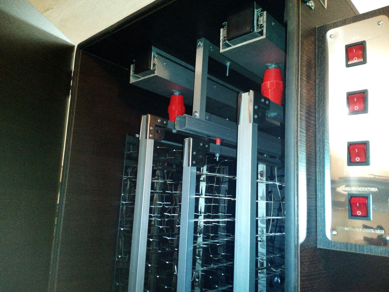 Установка электростатического копчения включает в себя ещё и техническое обслуживание, которое представляет собой периодическую чистку охладителя, крюков и сеток. При необходимости охладитель разбирают, а потом складывают обратно.