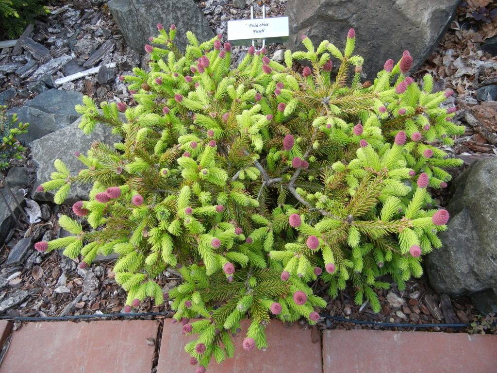 результат мутации ели обыкновенной сорта Acrocona — необычное растение неравномерной формы, высотой 30-100 см и диаметром 50 см. Особенно живописно смотрятся маленькие розовые шишки, образующиеся на разной длины побегах.