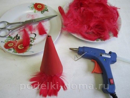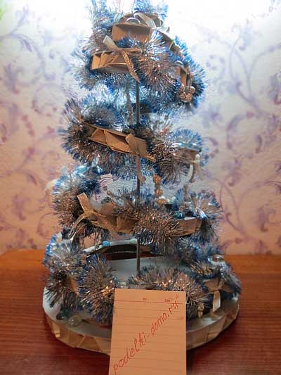 Из ватмана сделан конус, по верх с помощью клеевого пистолета приклеена мишура. Украшена бусами, маленькими шариками и бантом.