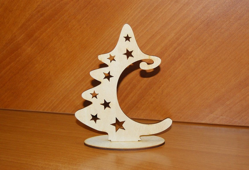Если в хозяйстве имеется механический лобзик, с его помощью можно сконструировать совершенно очаровательную елочку, которая, к тому же, может использоваться, как настенная полочка или настольная этажерка.