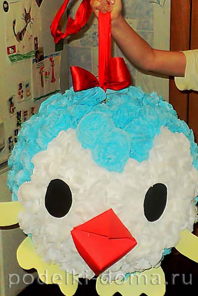 Затем дополнили поделку элементами из цветного картона: глазки, клюв, крылышки, ножки. Чтобы нашего «пингвинёнка» можно было повесить на ёлку, мы закрепили ему ленточку, привязав её за хвостик шарика, который оставили вверху.