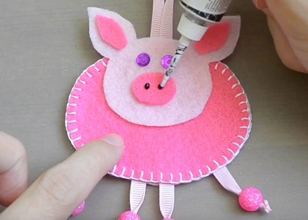 приклеиваем фиолетовый бант и рисуем черной акриловой краской ноздри.