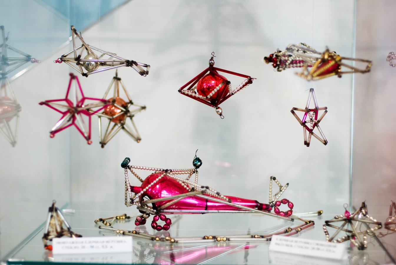 Первые стеклянные игрушки: шары, бусы, сферические зеркальные предметы в виде прожекторов и сосулек — появились на российских елках в середине XIX века. Они были тяжелее современных, потому что делались из толстого зеркального стекла. Первоначально большая часть стеклянных украшений была иностранного производства, однако совсем скоро их стали изготавливать и в России.