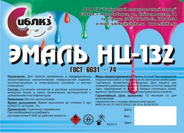 Производится данная смесь в 2 похожих друг на друга вариантах – НЦ-132 К и НЦ-132 П. Данные растворы по своему составу практически одинаковы, но они имеют разную условную вязкость и различный объем сухого остатка. Смесь с маркировкой “К” наносится при помощи кисточки, а краска с буквой “П” наносится посредством распыления из пульверизатора. Фасуется этот раствор в металлических банках по 0,8 и 1,5 килограмма, а также можно заказать эмаль в больших промышленных емкостях.