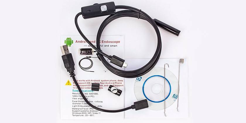 Эндоскопическая камера поставляется в упаковке вместе с диском для установки программного обеспечения на ноутбук или компьютер. Количество дополнительных аксессуаров (Wi-Fi модуль, держатель, насадки) зависит от модели прибора и его стоимости. При распаковке стандартной комплектации девайса вы найдете следующее: