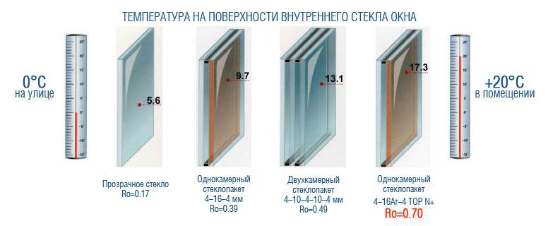 Руководство производства АО Софос в первую очередь обращает внимание на то, что температура на поверхности стекла варьируется с учетом роста коэффициента сопротивления тепловых передач. Поэтому для изготовления стеклопакетов используются стекла с низкоэмиссионным покрытием. . Например, обычный стеклопакет при двадцатиградусном морозе обеспечит в помещении температуру 19-20 градусов тепла