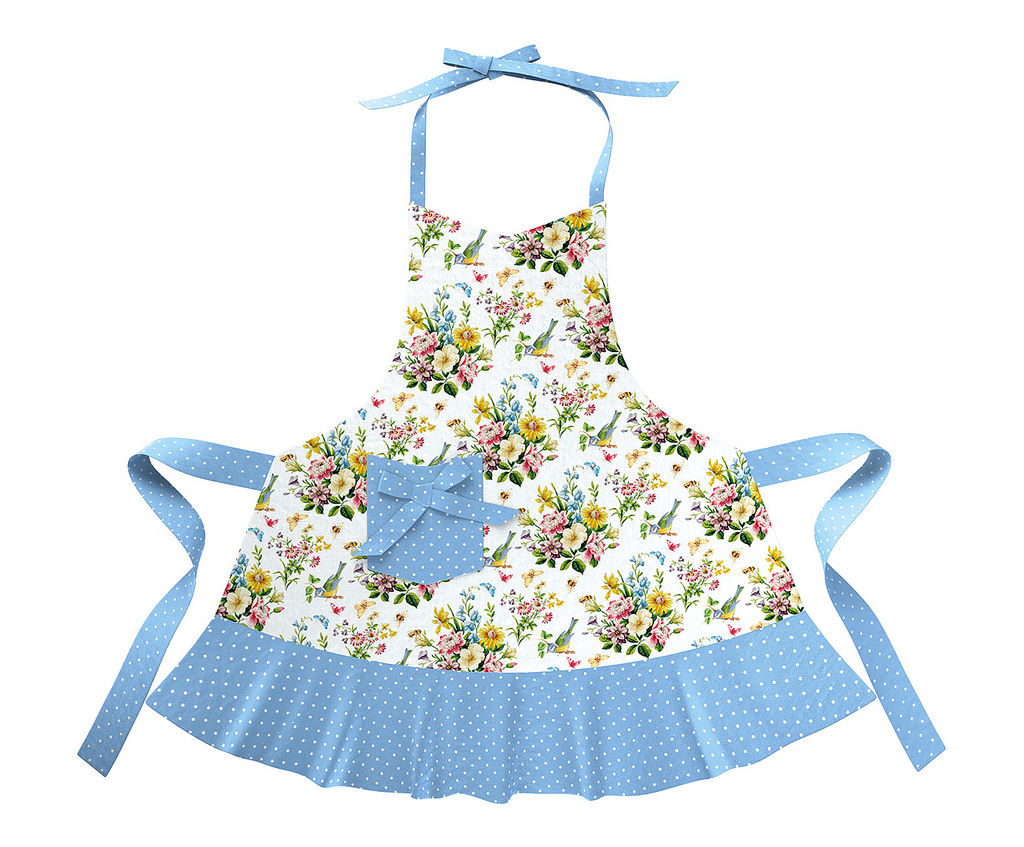 Это легкие изящные фартуки простого кроя с кружевной отделкой и цветами. Выполняются они из хлопковых или льняных тканей. В стиле чаще встречаются пастельные оттенки. Для акцентов используют розовый или голубой цвета.