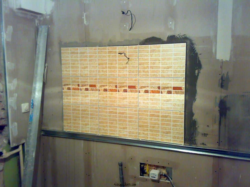 Фартук большой площади укладывается на специально оштукатуренную стену, а не на гипсокартонную плиту, т.к. она может треснуть и расколоться под такой нагрузкой.