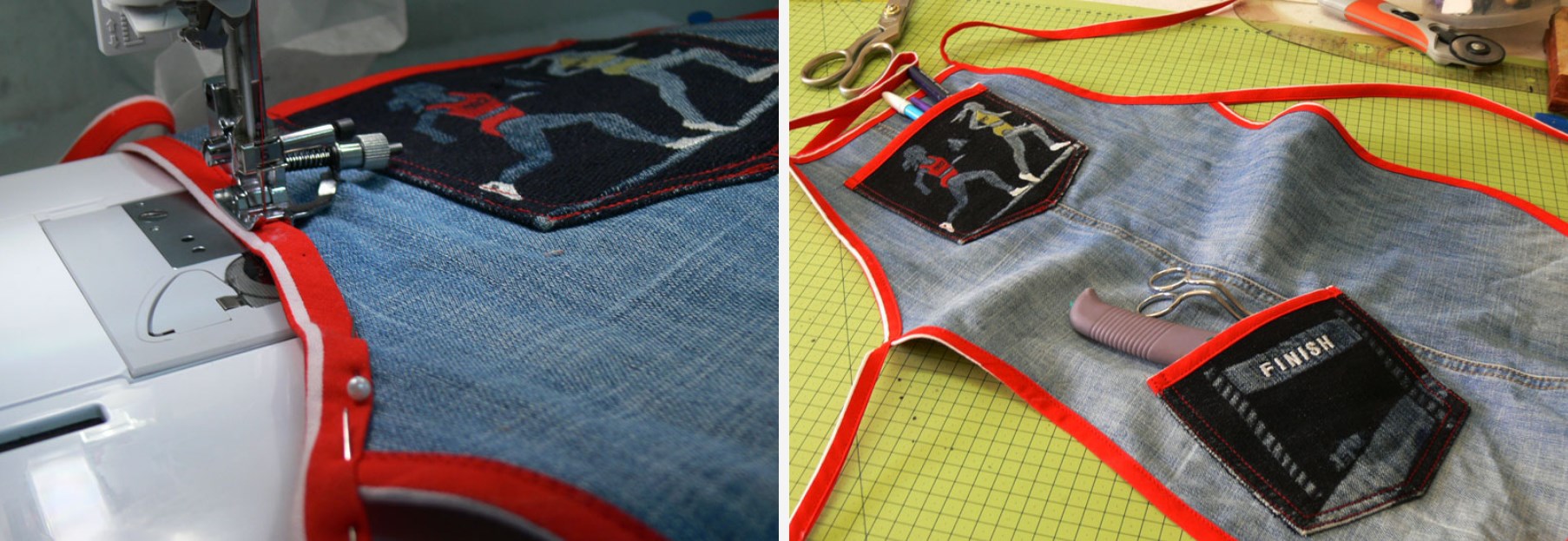 Передник готов. Осталось только удобно расположить на нем карман и аккуратно пристрочить его с трех сторон, отступив от края 1,5–2 миллиметра.