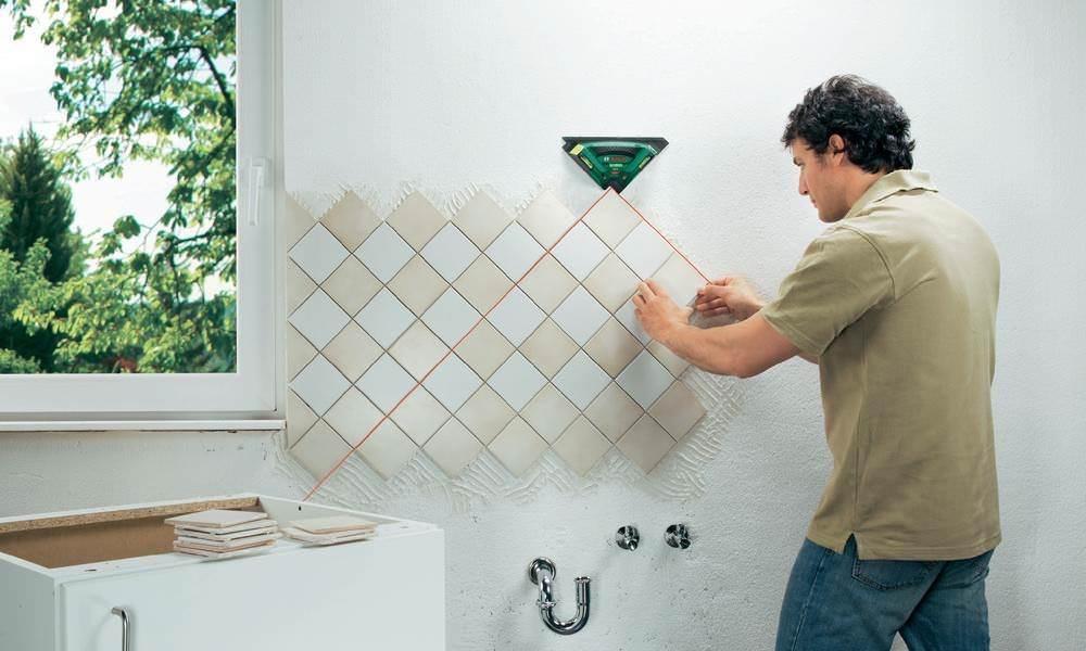 Лучше всего при отделке фартука на кухне использовать лазерный уровень. Он идеально выведет линию, гарантируя отсутствие погрешностей