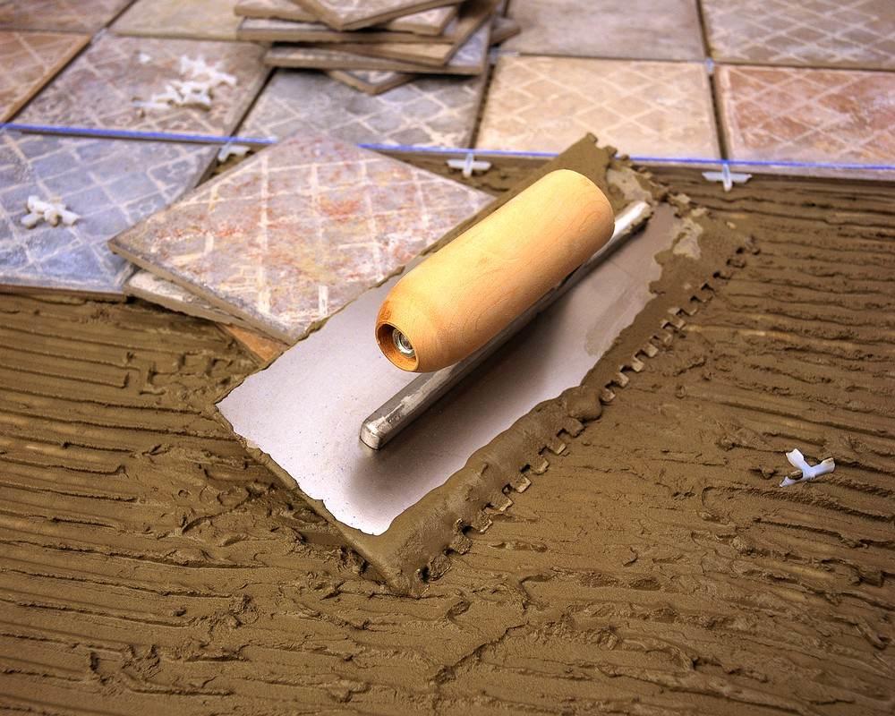 После прикладывают плитку и вдавливают, простукивают по диагонали, выгоняя воздух.
