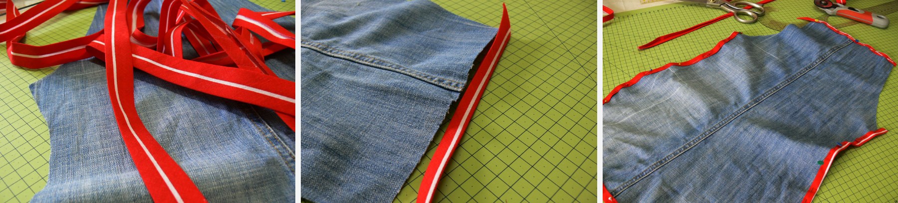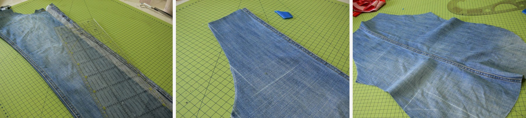 Для пошива изделия используют старые джинсы. Переднюю часть верха брюк без боковых швов вырезают. Заднюю часть брюк распарывают. Из детали с карманом выкраивают нагрудник (карман должен быть по центру).