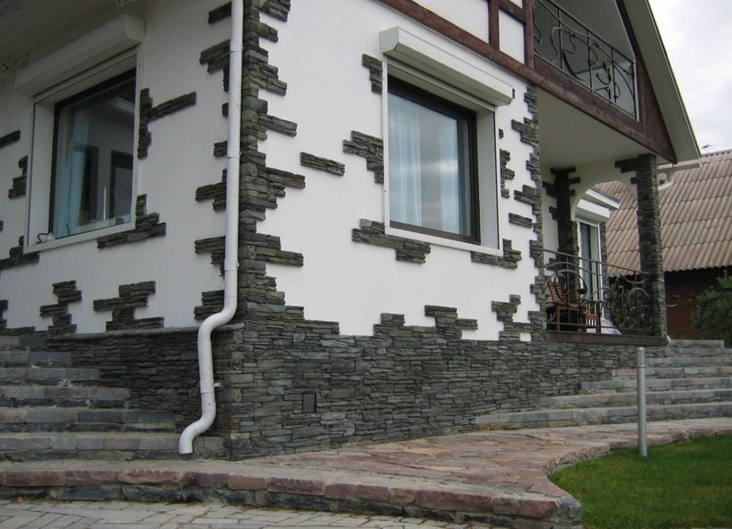 Со временем его оттенок становится темнее, но чтобы избежать этого, можно покрыть поверхность защитным лаком. Если вы против использования природного камня, можете облицевать дом искусственной плиткой, повторяющей текстуру натурального материала: