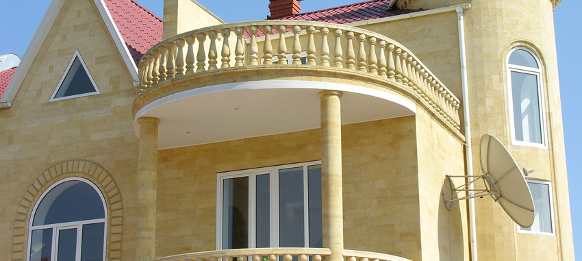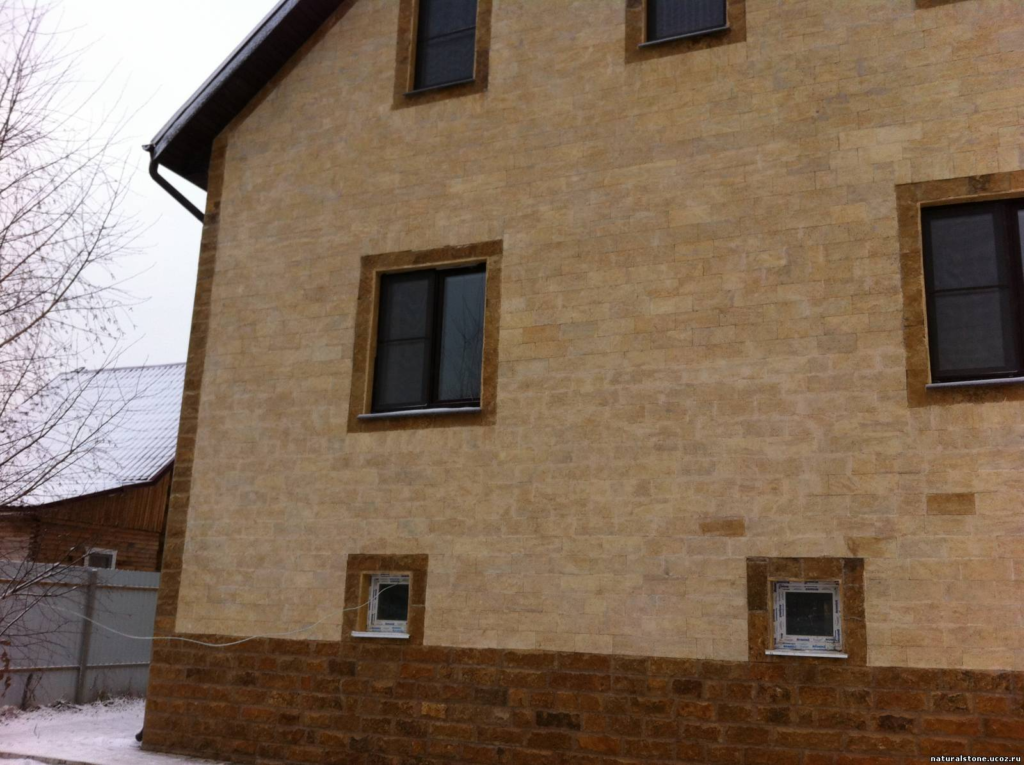 А вот так смотрится на фасаде нарезанный под плитку известняк: