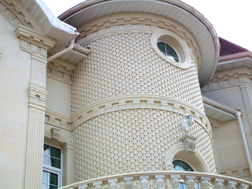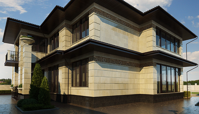 Очень удачно комбинируются элементы декора присущие современным архитектурным веяниям и пришедшие к нам из дальних веков. В отделке фасада эклектического дома превосходно будет смотреться сочетание четких форм и больших окон с вычурными колоннами, рельефными фризами и ковкой.