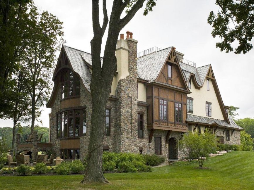Коттедж рустикальной и готической постройки облицовывается камнем, реже – грубым кирпичом, однако, есть еще несколько не менее удачных способов отделки фасада дома, которые сделают его еще выразительней. Интересно смотрится комбинированная отделка, в которой использованы кирпич и светлая штукатурка. С появлением последней дом утратит характерную стилю мрачность и станет несколько «приветливее». Дополнительными штрихами, придающими отделке завершенность, станут множественные кованые элементы и стремящиеся вверх линии.