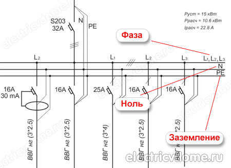 На рисунке представлена современная сеть с отдельным подключением заземления и рабочего нуля. Предусмотрена возможность подсоединения трех,- и однофазных нагрузок.