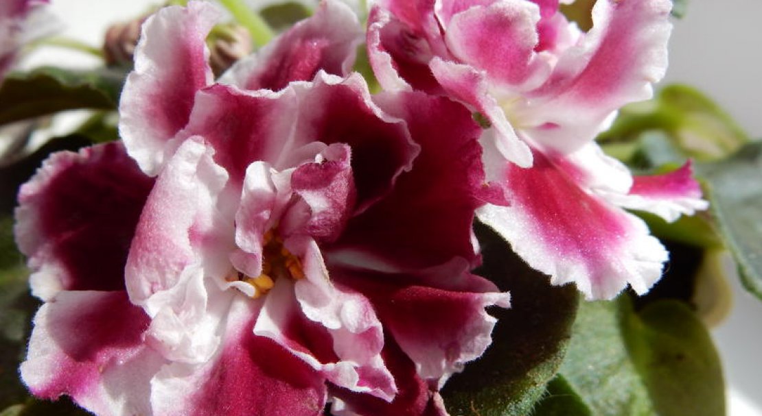 Цветы махровые, довольно большие, с волнистыми лепестками. На белом фоне выделяются крупные вишневые пятна. Яркий, контрастный окрас является визитной карточкой сорта. Морозная вишня, как и фиалка Зимняя вишня, реагирует на высокую температуру.