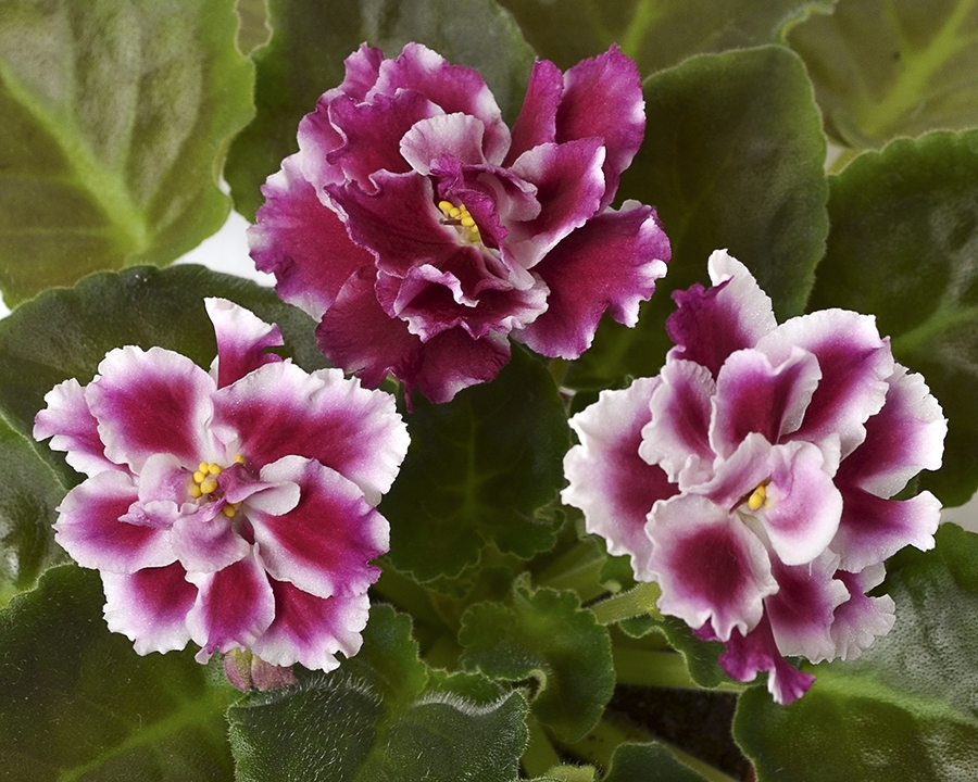 Цветы уже не с пальчиковым окрасом, а белой каймой. А главное, очень насыщенный, бархатно-бордовый цвет. Смотрится очень привлекательно. В народе его прозвали – «Дикая Вишня». Как говорят коллекционеры, он очень хорошо повторяется, при размножении черенкованием.