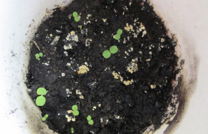 - После прорастания всходов плошку переносят в более светлое место (чтобы не вытянулись ростки). Первые листки появятся через полтора месяца.