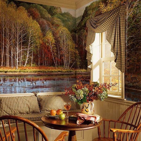 Это изображения, имеющие перспективу. Как пример: открывающийся с крыши вид на город, уходящая за горизонт дорога, причал, цветочные поля с силуэтами мельниц. Последняя тема широко используется в стиле прованс. Если дополнить обои мебелью из натуральной древесины и подходящим текстилем, эффект французской деревушки будет полным.
