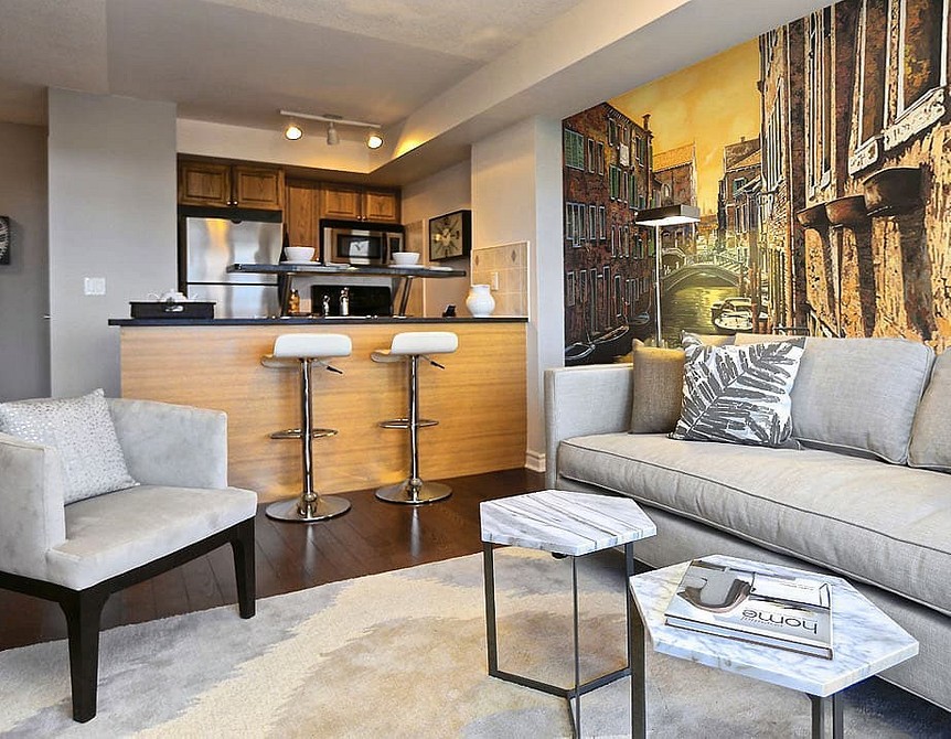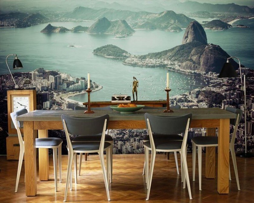 Фотообои с реалистичным панорамным сюжетом отлично подойдут для создания современного дизайна такого интерьера.