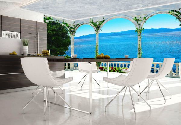 Если вам хочется подчеркнуть атмосферу свежести, легкости и чистоты в кухонном интерьере – выбирайте фотообои, выполненные в холодных тонах. Это могут быть голубые, серые, лавандовые, синие оттенки. Один из самых распространенных вариантов такого цветового оформления – фотообои с морскими пейзажами.