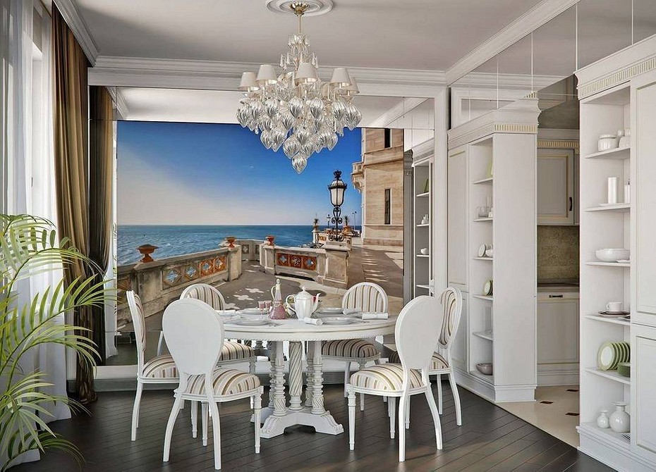 Этот прием используется в небольших кухнях. Изображение занимает часть стены в качестве картины или в виде вертикального полотна от пола до потолка. Таким образом можно зрительно увеличить высоту комнаты, особенно если выбрать в качестве сюжета деревья, высокие здания или башни. Фальш-окно добавит помещению объема и раздвинет границы комнаты. В такое окно может быть видно небо или красивый ландшафт.