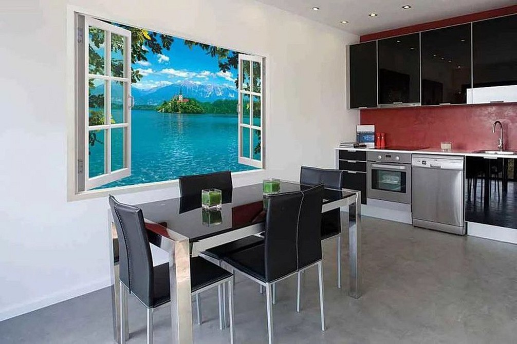 Для кухонь с маленьким окном, вполне можно организовать еще одно, поклеив к примеру фотообои изображающие окно с видом природы или панорамы города в безоблачный день
