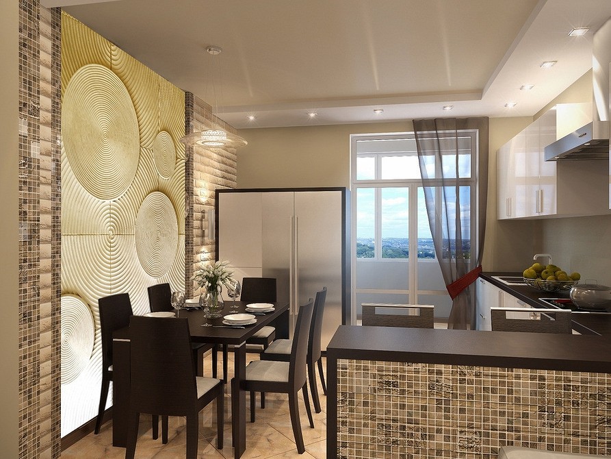 Способ №4 – оформление студии. Любая просторная кухня, сочетающая в себе несколько зон с разным предназначением, обязательно должна иметь акцент. Используйте необычные отделочные материалы для декорирования стены возле стола или барной стойки.