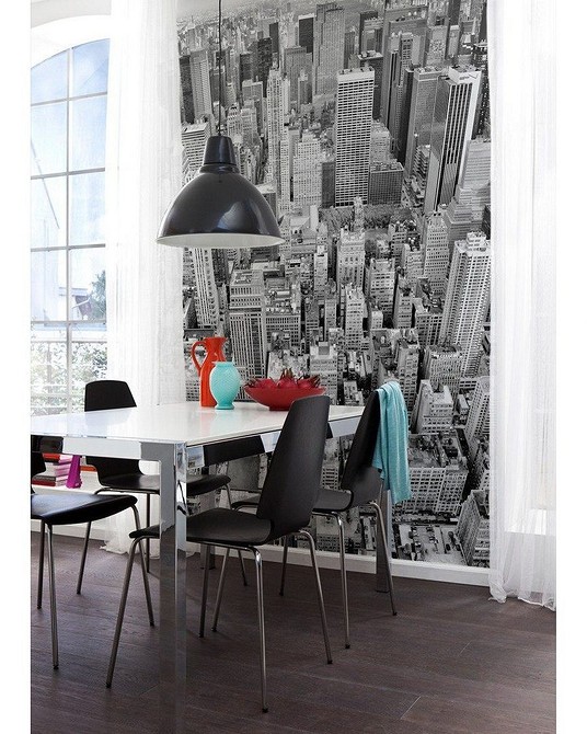 Помните! Яркие фотообои рекомендуется использовать только в монохромных интерьерах. Светлые или черно-белые изображения можно повесить в любом интерьере кухни, но при необходимости такой дизайн разбавляется яркими аксессуарами.