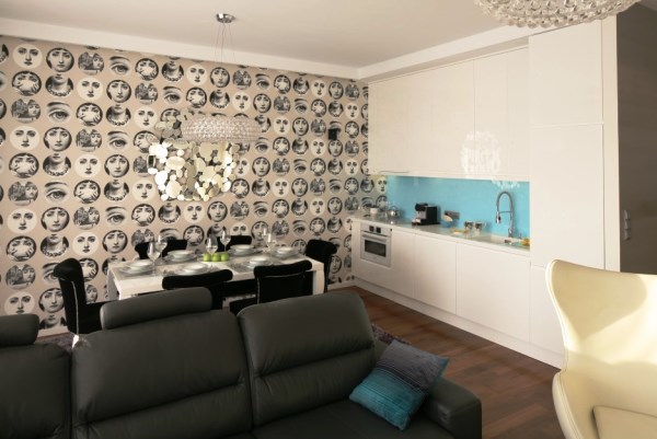 Способ №1 – фоновая отделка. Однотонные или узорчатые обои с неяркими узорами можно поклеить в каждой зоне комнаты, не выделяя столовую и кухню. Поскольку такое оформление не предполагает наличия акцентных обоев на стенах, оживите интерьер с помощью ярких аксессуаров или текстиля.