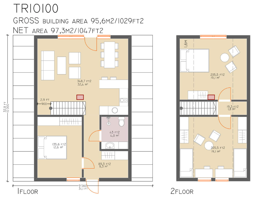 We designed the TRIO series trying to provide a set of affordable “wide” A-frame house plans, with living areas ranging from 52m2 (556 sq ft) to 140m2 (1495 sq ft).