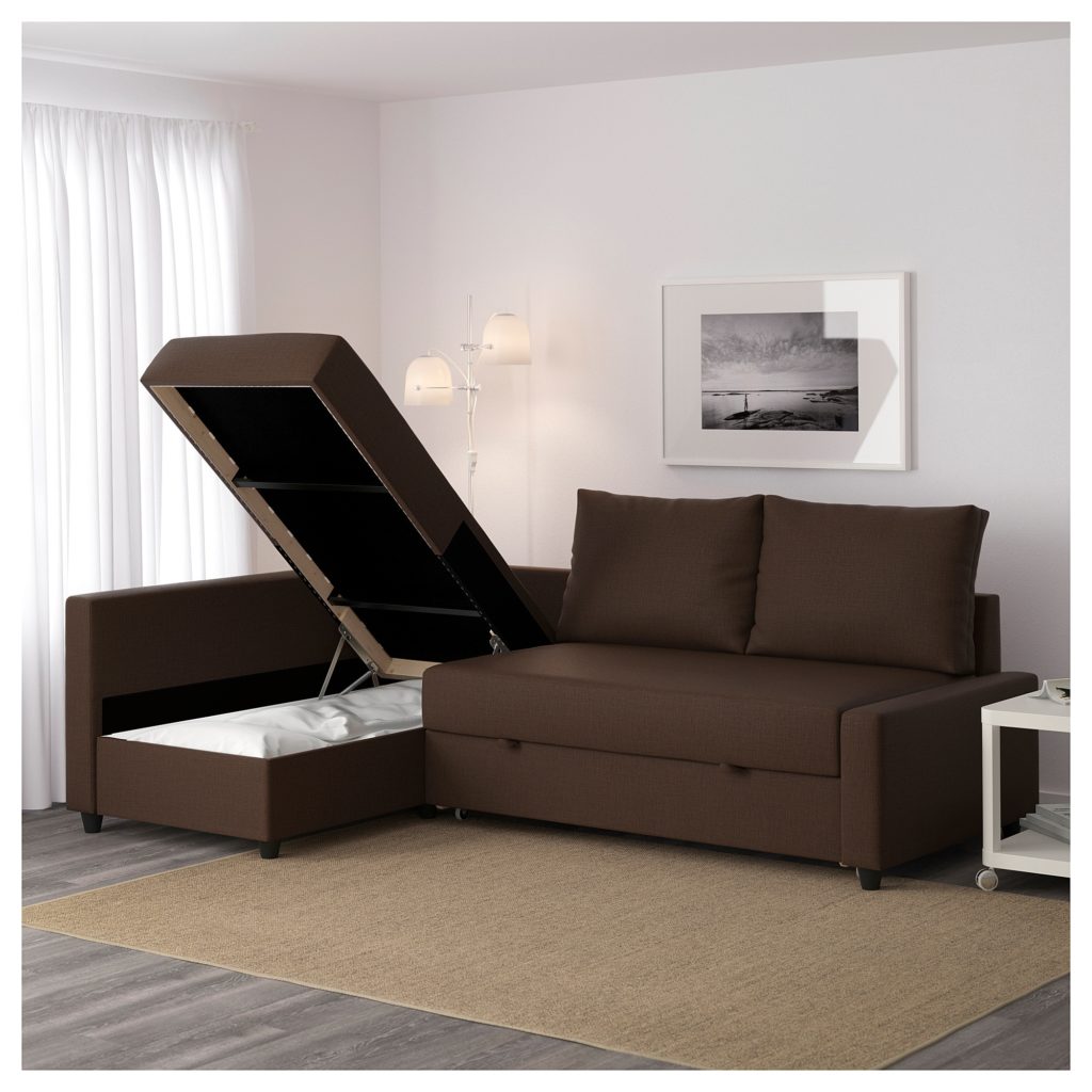 - Угловой диван-кровать с козеткой и местом для хранения белья. Козетку при сборке можно установить с любого бока дивана. Крышка на удлиненной части может фиксироваться в поднятом положении. Стоимость этого варианта раскладного дивана в магазинах “Икеа” составляет около 22 тысяч рублей (вне зависимости от цвета чехла).