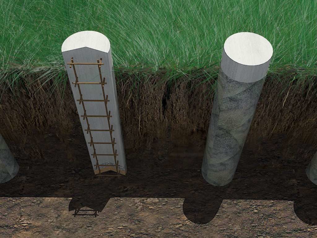 Вместо дорогостоящей монолитной плиты часто применяется фундамент из столбов. В разрезе опоры имеют форму прямоугольника, квадрата, круга. Материалом служат железобетонные колонны, блоки заводского изготовления, кирпич. О том, как сделать сваи своими руками, смотрите в этом видео: