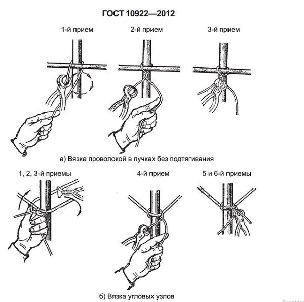 Концы поднимаются вверх, специальным крючком захватывают петлю и скручивают ее на 4-6 оборотов, плотно притягивая прутки друг к другу. Соединение получается прочным, а навык работы приобретается очень быстро.