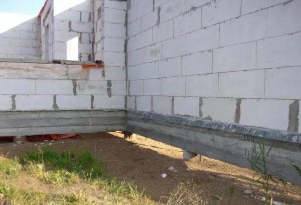 Усилению углов и стыков уделяется особое внимание. Сечение монолита имеет форму прямоугольника; ширина фундамента под газобетон должна на 20 см превышать толщину несущей стены.