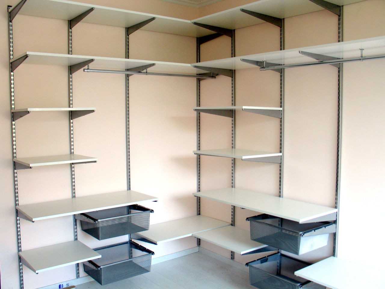 После основательной подготовки первым действием очищается место, на котором будут устанавливаться перегородки и стеллажи, затем собирается несущий каркас и крепится к стенам, полу и потолку гардеробной.