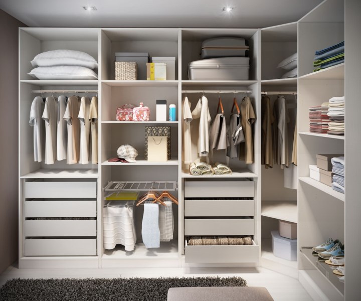 К тому же, когда в гардеробной нет шкафов с дверцами, одежда постепенно пропитывается пылью.