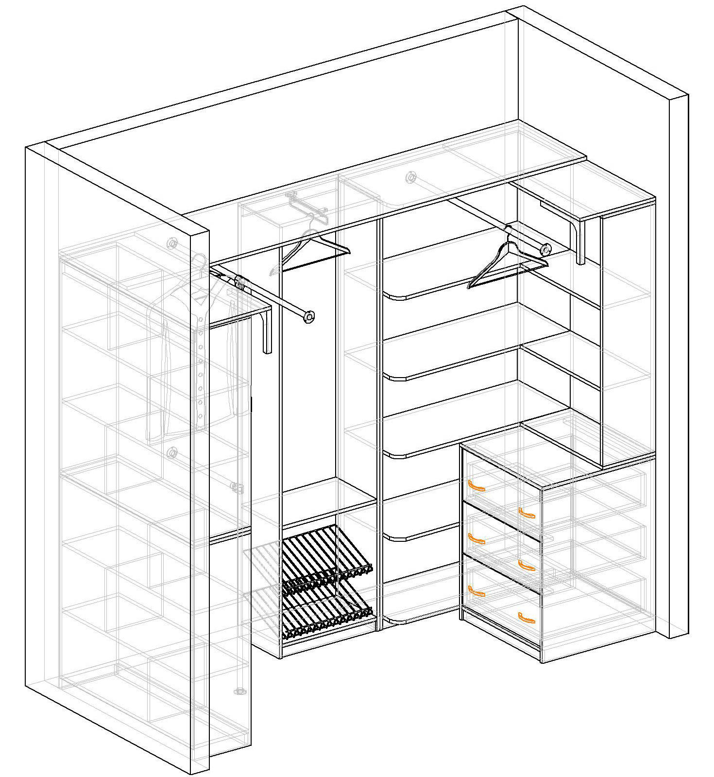 - Создание эскиза. На рисунке отображается нужное количество полок, штанг для одежды и выдвижных ящиков.