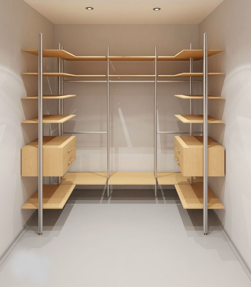 В случае когда, в силу сложившихся обстоятельств, гардеробная маленькая и увеличить ее нет возможности, остается искать выход в конструкции из небольших полок. Так будет удобнее убирать на них и потом доставать нужные вещи.
