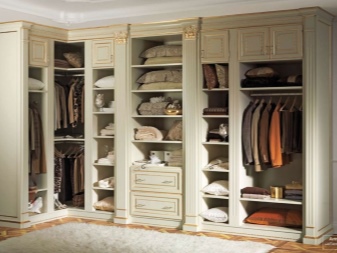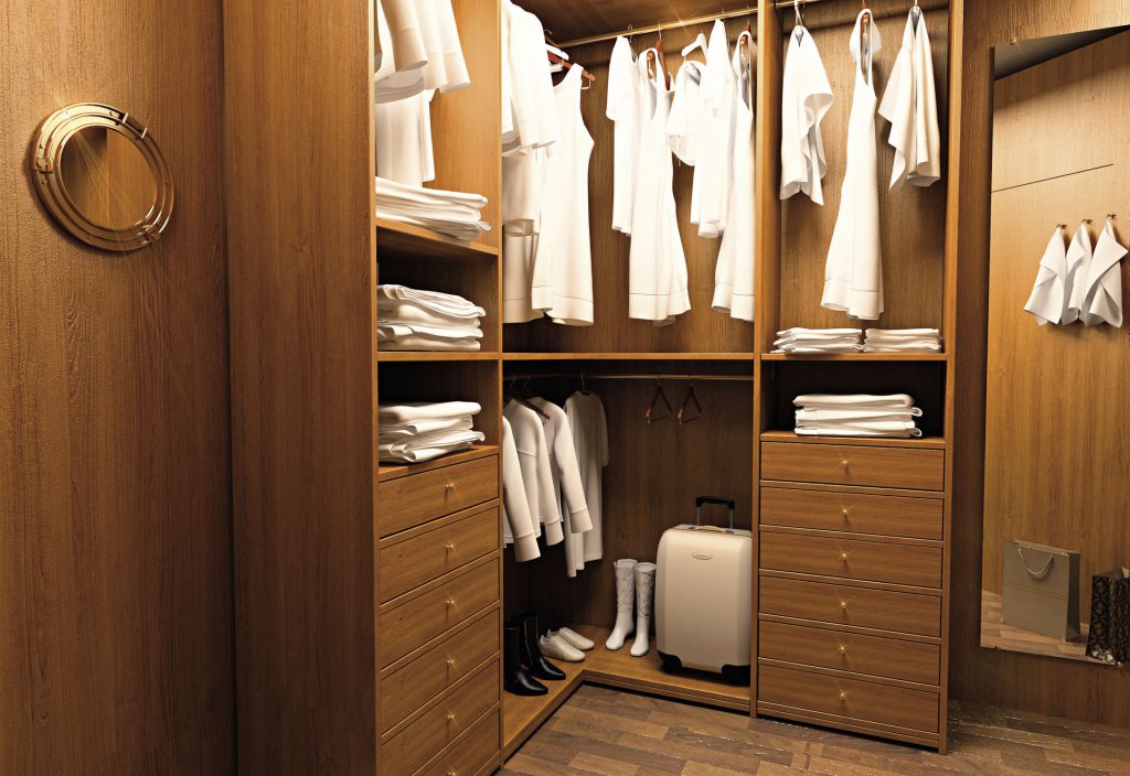 Для комфортного хранения вещей используют угловую гардеробную систему. Она должна включать достаточное количество стеллажей, выдвижных ящиков, штанг под плечики и трансформируемых вешалок.