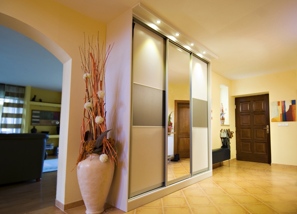 С дверями купе. Хорошо подходит такой вариант для зрительного расширения пространства в тесной маленькой прихожей, ведь чаще всего такие двери выполняют функцию зеркал. Двери купе не мешают в открытом виде, но стоит учесть, что затрудняется единовременный доступ ко всем отделениям гардероба.