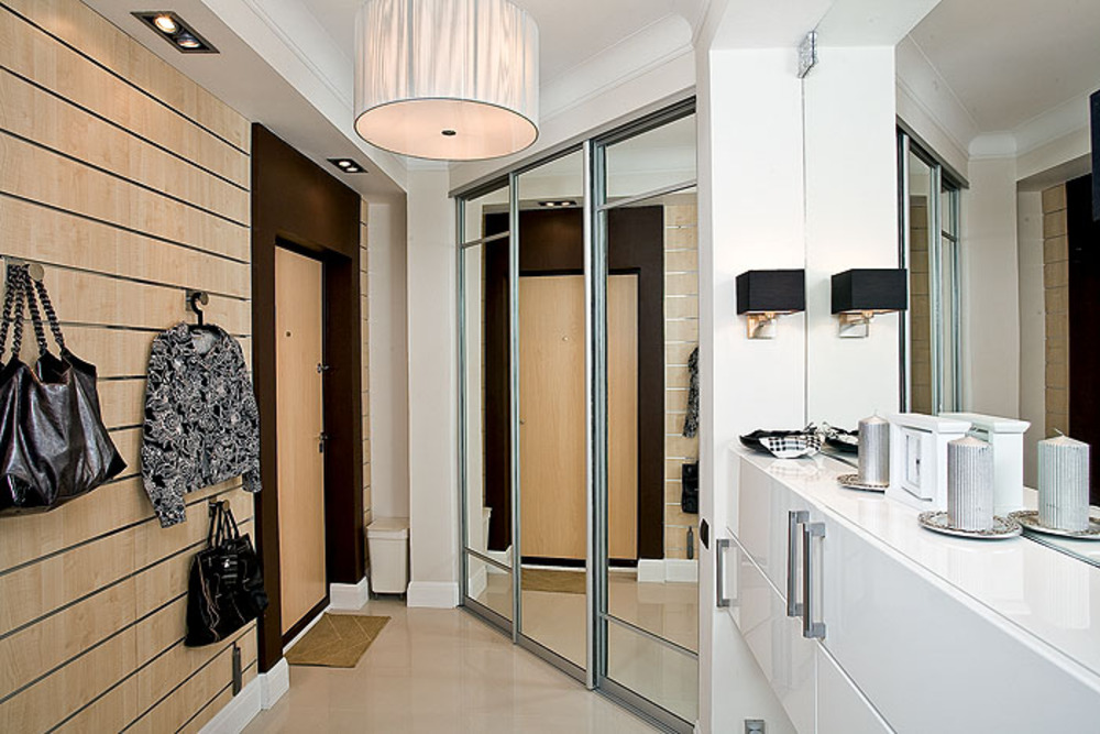 Использование фотообоев и зеркал на длинной стене коридора позволяет визуально расширить внутреннее пространство. Шкафы-купе светлых тонов, светильники по центру длинного узкого коридора наиболее уместны здесь.