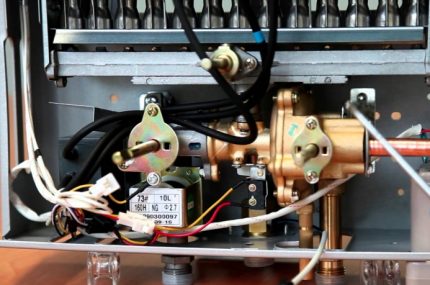 Конструктивные составляющие газовой колонки, находящиеся внутри корпуса. Здесь изображено газовое оборудование закрытого типа