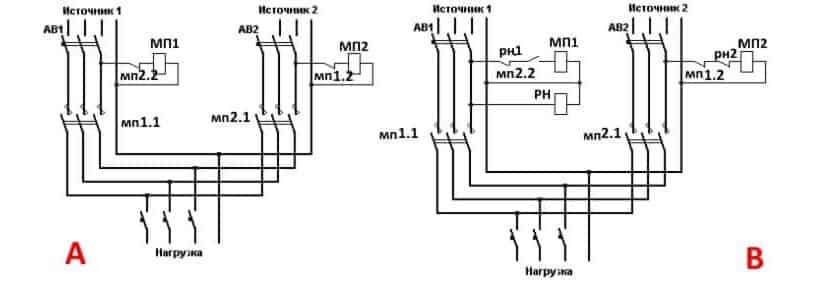 На изображении А – исполнение двухстороннее. Обе секции имеют одинаковый приоритет. Такое подключение позволяет переключать линии, не зависимо от наличия напряжения в каждой из них.