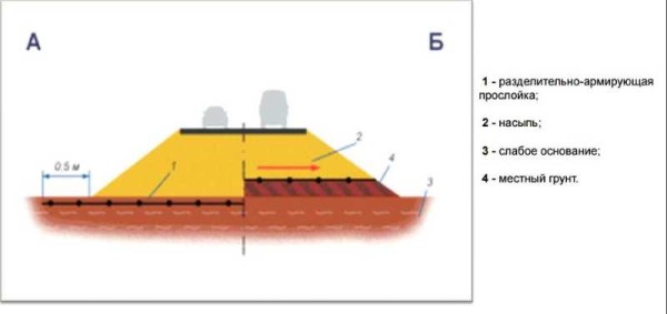технология защитно-армирующей прослойки – материал укладывается поверх существующего основания, выступает за склон на 0,5 м и удерживает верхнюю насыпь от расползания;