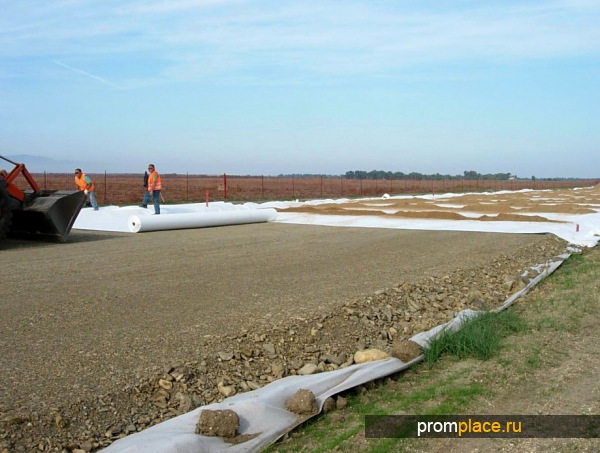 - При укладке геотекстиля в ветреную погоду, для закрепления материала на месте используется крупный заполнитель, укладываемый с определенной периодичностью по поверхности нетканого полотна.